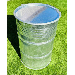 Rénové et en bon état, ce fût métallique avec couvercle convient aussi bien pour une décoration intérieure, comme extérieure.